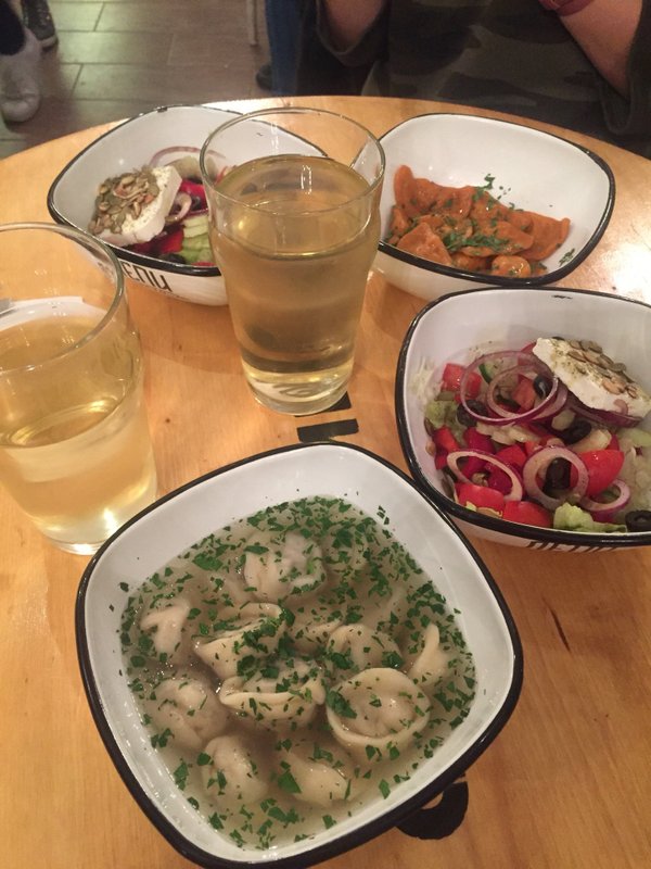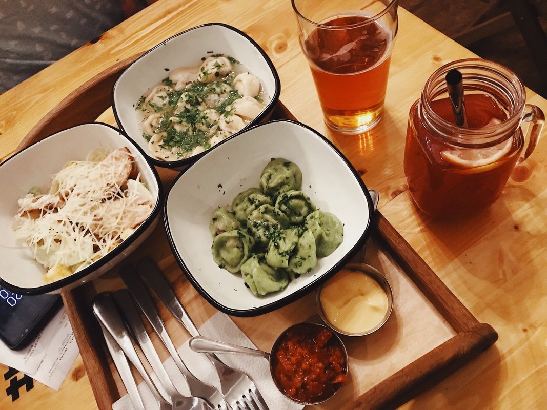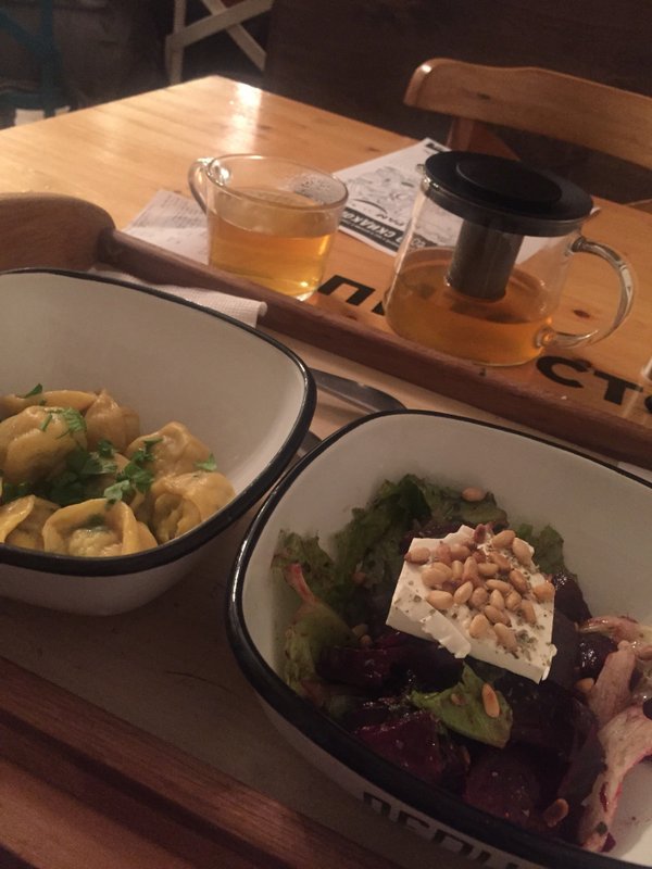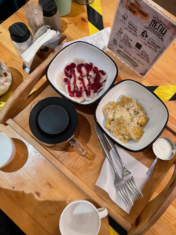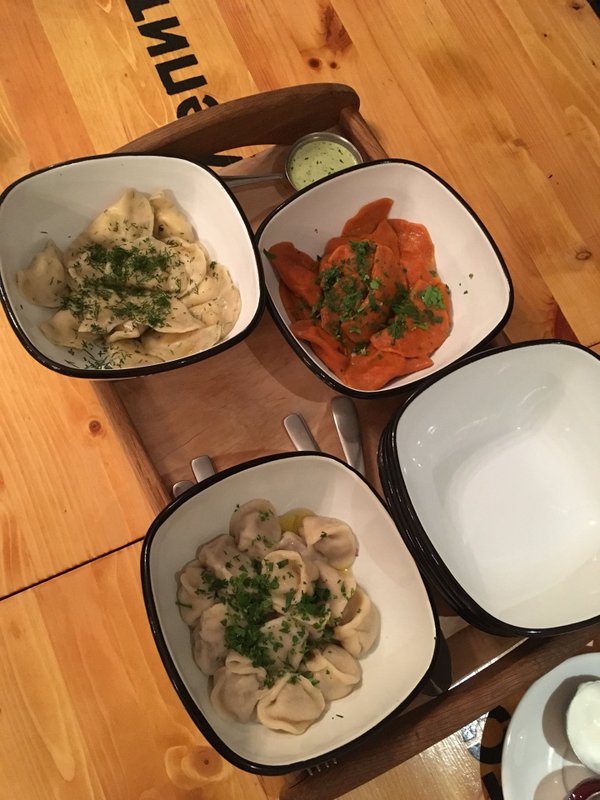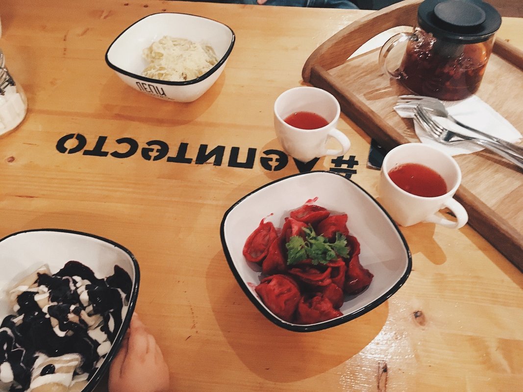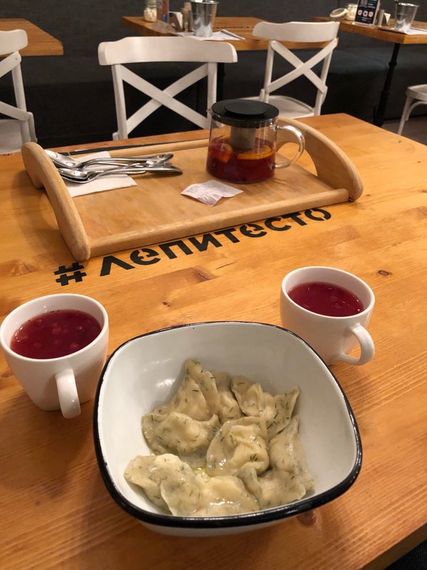 Уютная атмосфера зала.Пельмешки карбонара на 4+ по пятибальной шкале, а вот вкус России с белыми грибами на твёрдую 3.Варенички с черникой просто бомба! Пять из пяти!Отличный чай.Нам понравилось.